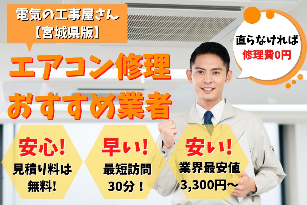 宮城県のエアコン修理業者「電気の工事屋さん」は、宮城県全域でエアコン修理をおこなっています。即日最短30分で経験豊富な技術スタッフが駆けつけます!エアコン修理費は業界最安値の3,300円(税込み)より承っており、直らなければ修理費0円!お電話やメールで問い合わせをしますと、その場で概算のお見積りもご提示するので安心です。