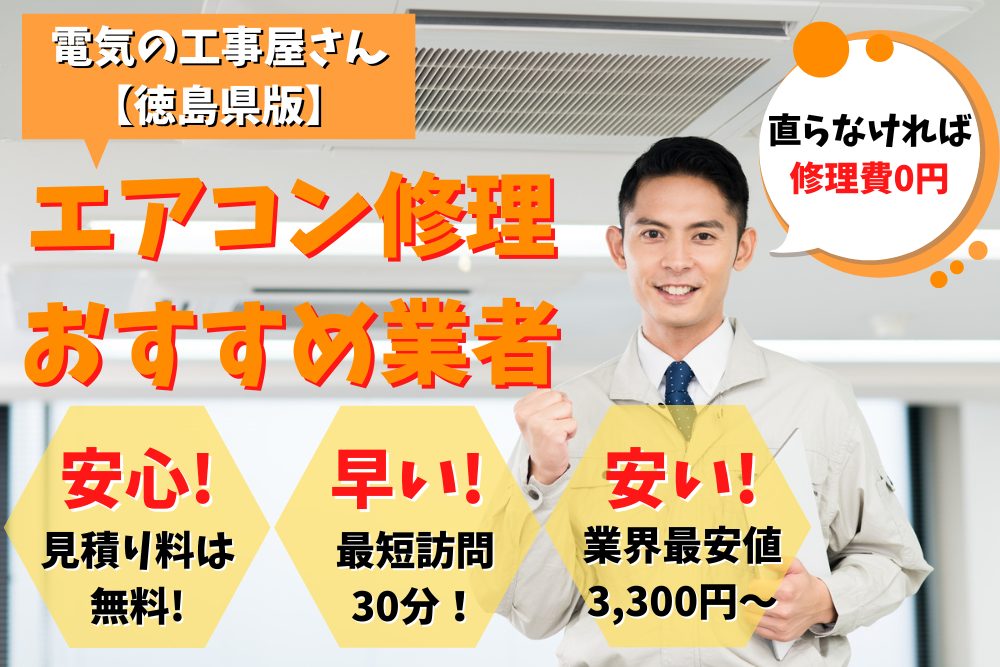徳島県でエアコン修理を依頼する際、どこの業者にお願いすれば良いのか?このページでは、徳島県にある安くて即日対応するエアコン修理するおすすめ業者をランキング形式でご紹介します。またページ後半にはエアコン修理業者を選ぶ際のポイントをまとめました。